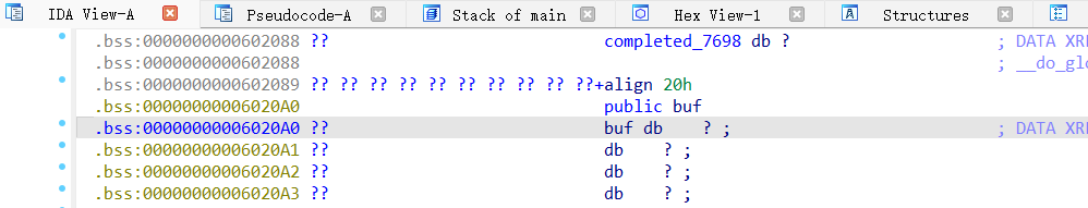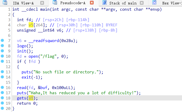 可以看到程序先以及读取了/flag文件,然后可以看到buf在bss段,gets(v5)明显的栈溢出漏洞