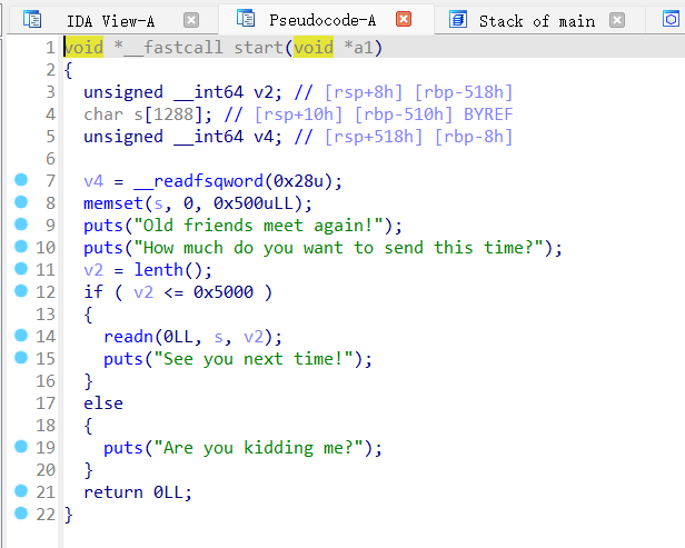 子进程里面先让用户输入要输入的大小,如果大于0x5000就输出”Are you kidding me?”,如果小于等于就进行读取明显存在栈溢出