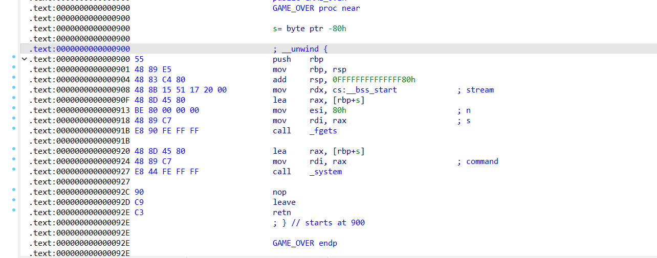 1 2 3 4 5 6 7 8 9 10 11 12 13 14 15 16 17 18 19 20 21 22 23 24 25 26 27 28 29 30 31 32 33 34 35 36 int __cdecl main (int argc, const char **argv, const char **envp) { __int64 v3; char v5[1032 ]; __int64 v6; char v7; __int64 v8; is_detail = 0 ; go(argc, argv, envp); logo(); fwrite(">> " , 1uLL , 3uLL , _bss_start); fflush(_bss_start); v8 = 0LL ; while ( !feof(stdin ) ) { v7 = fgetc(stdin ); if ( v7 == 10 ) break ; v3 = v8++; v6 = v3; v5[v3] = v7; } v5[v8] = 0 ; if ( (unsigned int )init(v5) ) { qsort(files, size_of_path, 0x200u LL, cmp); search_file_info(); } else { fflush(_bss_start); set_secommp(); } return 0 ; }